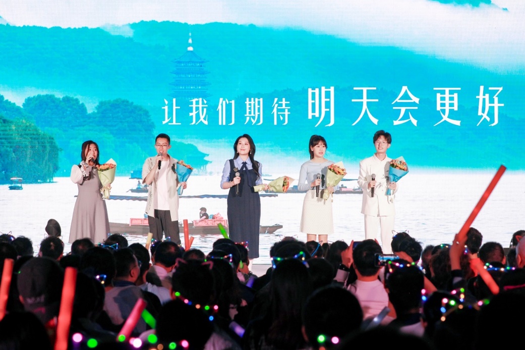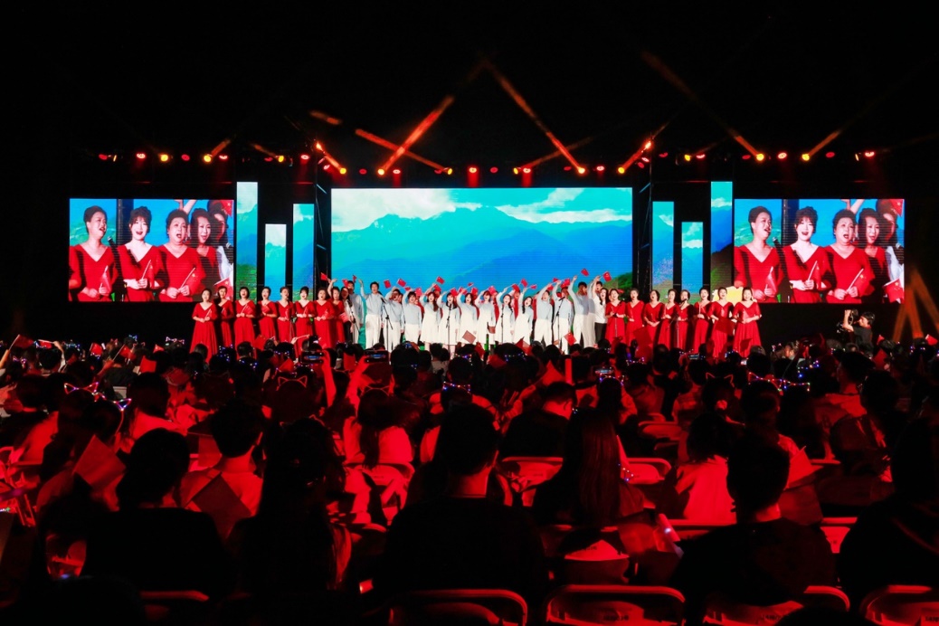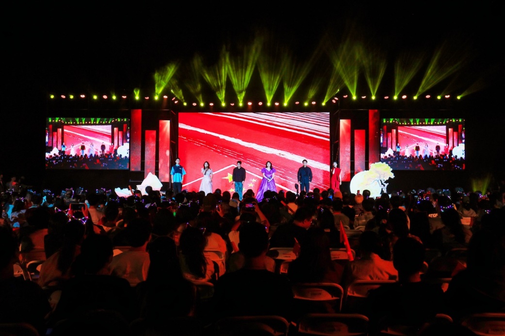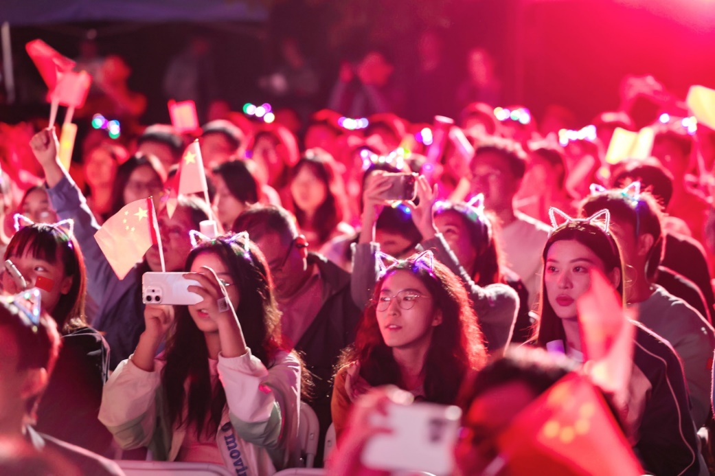 十佳歌手聯(lián)袂獻唱的《我愛你中國》向祖國送出最深情的告白,用歌聲獻禮祖國華誕。大屏幕上一幅幅中國壯麗風(fēng)光、建設(shè)成就和人民幸福生活的影像徐徐展開,與歌聲交織成一曲動人的視聽交響。 “我愛你中國,心愛的母親”唱響時,全場觀眾深受感染,情不自禁地起身揮動手中的國旗,一同加入合唱。霎時間,草坪化為一片涌動的紅色海洋,激昂的歌聲與澎湃的激情交織,將晚會現(xiàn)場化作一堂生動而深刻的愛國主義課堂。