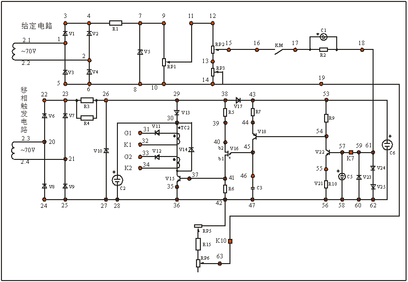 該電路中給定電壓與電壓負(fù)反饋和電流正反饋的偏差控制V22輸出電壓的大小,從而控制電流的大小,從而實(shí)現(xiàn)脈沖移相。