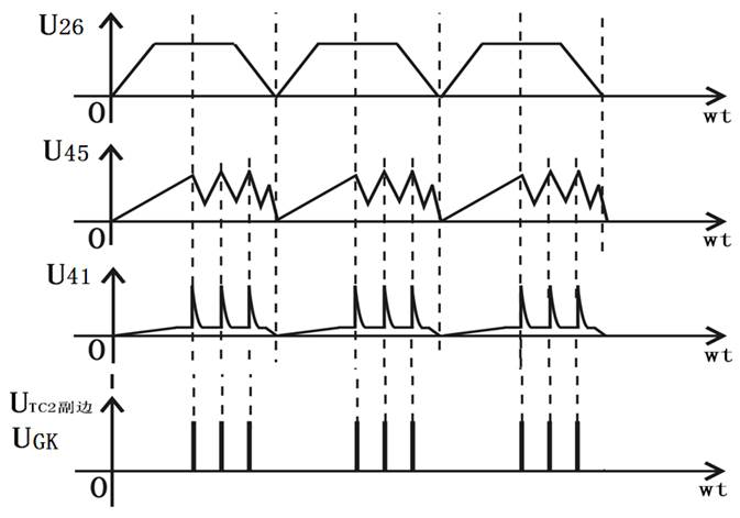 由變壓器TC1副邊輸出約70V±10%的交流同步電壓,經(jīng)V6~V9橋式全波整流,再由穩(wěn)壓管V10進(jìn)行削波,從而得到梯形波電壓,其過(guò)零點(diǎn)與電源電壓的過(guò)零點(diǎn)同步,梯形波通過(guò)R7、R9、V18及V22組成的恒流源向電容C3充電,當(dāng)充電電壓達(dá)到單結(jié)晶體管V16的峰值電壓UP時(shí),單結(jié)晶體管V16導(dǎo)通,同時(shí)由于放電時(shí)間常數(shù)很小,C3兩端的電壓很快下降到單結(jié)晶體管的谷點(diǎn)電壓Uv,使V16關(guān)斷,C3再次充電,周而復(fù)始,在電容C3兩端呈現(xiàn)鋸齒波形,在脈沖變壓器副邊輸出尖脈沖。在一個(gè)梯形波周期內(nèi),V16可能導(dǎo)通、關(guān)斷多次,但對(duì)晶閘管的觸發(fā)只有第一個(gè)輸出脈沖起作用。然后脈沖經(jīng)V15進(jìn)行功率放大,再經(jīng)過(guò)脈沖變壓器TC2便可在TC2副邊得到兩組相位一致的脈沖。