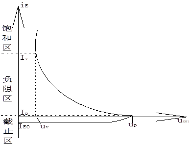 單結(jié)晶體管的特性曲線如圖2-2-14所示當(dāng)UBE1=0時(shí),IE=IEO;當(dāng)UEB1增大至UP(峰點(diǎn)電壓時(shí)),PN結(jié)開始正向?qū)ǎ藭r(shí)IE=IP(峰點(diǎn)電流);UEB1再增大一點(diǎn)管子就進(jìn)入負(fù)阻區(qū),隨著IE增大,UEB1減小,直至UEB1=UV(谷點(diǎn)電壓),IE=IV(谷點(diǎn)電流),UV取決于PN結(jié)的導(dǎo)通電壓和rb1 的飽和電阻rs;當(dāng)IE再增大,管子進(jìn)入飽和區(qū)。單結(jié)晶體管的三個(gè)區(qū)如圖2-2-14所標(biāo)注。