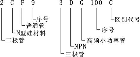 半導(dǎo)體器件的型號(hào)由五部分組成:第一部分用數(shù)字表示半導(dǎo)體管的電極數(shù);第二部分用拉丁字母表示半導(dǎo)體管的材料和極性;第三部分用拉丁字母表示半導(dǎo)體管的類別;第四部分用拉丁字母表示序號(hào),第五部分用拉丁字母表示區(qū)別代號(hào)。半導(dǎo)體器件型號(hào)前三部分的含義見表7,半導(dǎo)體器件型號(hào)識(shí)別示例如圖2-2-9所示。
