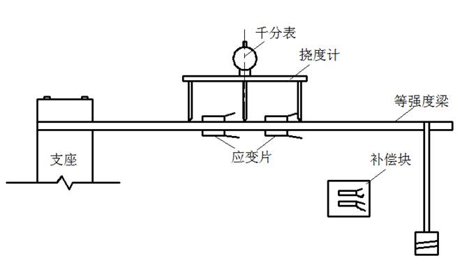 撓度計(jì)放在等強(qiáng)度梁上,把等強(qiáng)度梁裝于測(cè)驗(yàn)臺(tái)加力裝置上,試件上的應(yīng)變片接入應(yīng)變儀上,如圖3-1所示。
