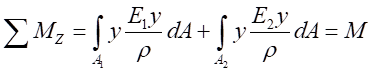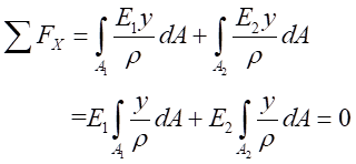 以材料尺寸相同的兩層矩形截面復(fù)合梁在純彎 曲情況下為計(jì)算模型,在其縱向?qū)ΨQ面內(nèi),承受彎矩 M的作用。上梁的彈性模量為E1,橫截面面積為A1,下梁的彈性模量為E2,橫截面面積為A2,且A1=A2,單梁的梁寬和梁高分別為b和h,在其縱向?qū)ΨQ面內(nèi),承受彎矩M的作用。兩種不同的材料由膠粘合制成。下面建立橫截面上的彎曲正應(yīng)力公式,平面假設(shè)與單向假設(shè)均成立。
