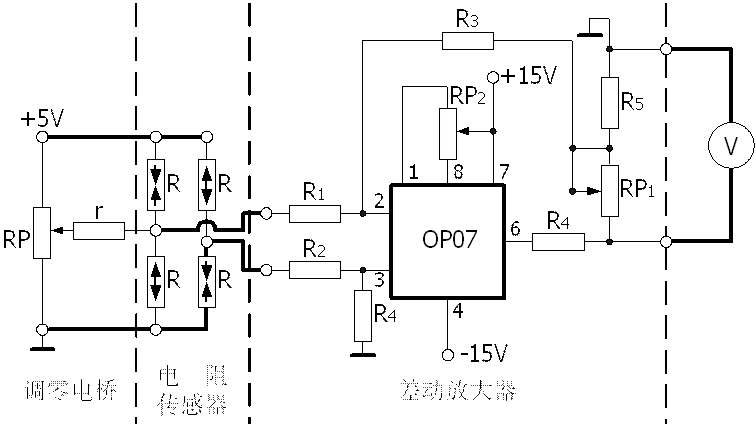 將四個應變片電阻分別接入電橋的四個橋臂,兩相鄰的應變片電阻的受力方向不同,組成全橋形式的測量電路,轉(zhuǎn)換電路的輸出靈敏度進一步提高,非線性得到改善。實驗電路圖見圖3-1,全橋的輸出電壓UO=4EKε