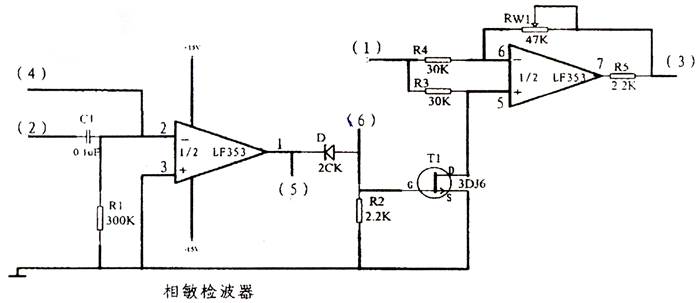 當(dāng)②或④端輸入控制電壓信號時,通過開環(huán)放大器的作用使場效應(yīng)晶體管處于開關(guān)狀態(tài)。從而把①端輸入的正弦信號轉(zhuǎn)撳與控制信號有關(guān)的檢波信號。