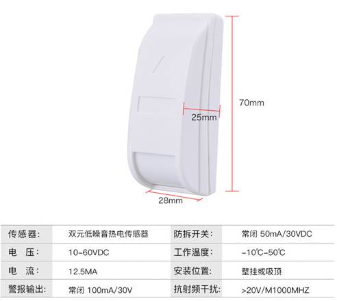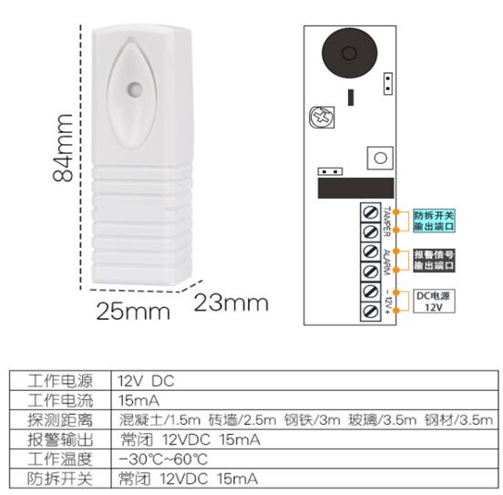 震動傳感器按在需要防范的地方,當(dāng)有不法分子試圖強(qiáng)行打開,撬開時振動傳感器監(jiān)測到有異常振動聲音時就會立即發(fā)送報警信號給報警主機(jī)驅(qū)動喇叭現(xiàn)場警示并通知相關(guān)人員有警情發(fā)生,本教材所用振動傳感器體積小巧,安裝方便不占空間更加隱蔽,適合各類需要防范設(shè)備的安裝。4.4.1 傳感器參數(shù)