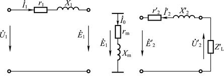 1.相關(guān)知識 1)負(fù)載運(yùn)行時(shí)的物理情況 2)負(fù)載運(yùn)行時(shí)的電磁關(guān)系 (1)磁動勢平衡方程式 空載時(shí)的主磁通 ![]() ![]() ![]() ![]() ![]() ![]() ![]() 這一關(guān)系式稱為磁動勢平衡方程式。 式(3-18)兩邊同除以N1并移相,得: ![]() 由式(3-19)可知,當(dāng)負(fù)載電流增大時(shí), ![]() ![]() (2)電壓平衡方程式 3)負(fù)載運(yùn)行時(shí)的等效電路 (1)繞組的折 (2)“T”形等效電路 經(jīng)過折算繞組,可得變壓器的部分等效電路,如圖3-16(a)所示。其中一、二次側(cè)之間的耦合作用,由主磁通在繞組中產(chǎn)生的感應(yīng)電動勢 ![]() ![]() ![]() ![]() ![]() ![]() (a)部分等效電路 ![]() (b)“T”形等效電路 圖3-16 變壓器的“T”形等效電路的形成過程 (3)近似和簡化等效電路 |