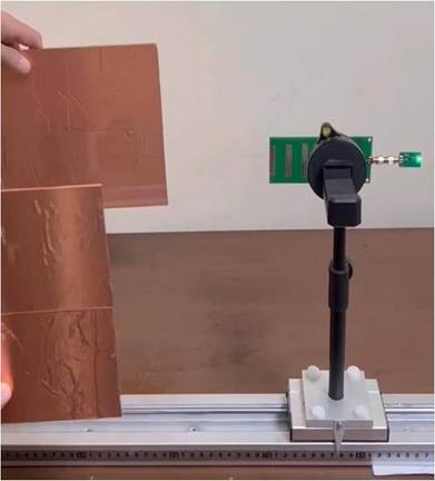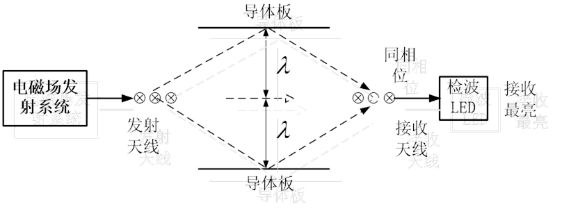 7、將發(fā)射天線為垂直極化天線,如圖3所示,反射板移動到位置d處LED燈最亮。