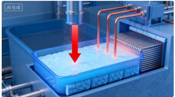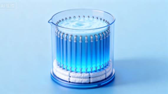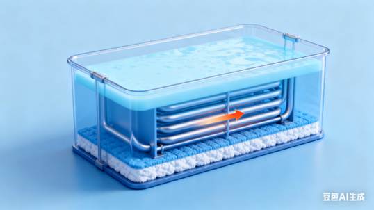 重點(diǎn)展示裝置結(jié)構(gòu)(含容器、石蠟、換熱管、保溫層)。風(fēng)格為簡約科技風(fēng),藍(lán)色調(diào)為主,突出熱量流動(dòng)示意(紅色箭頭表吸熱,藍(lán)色箭頭表放熱)。