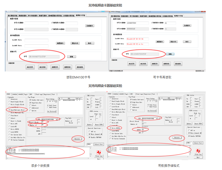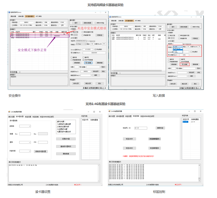 單卡及多卡EPC識別:單步識別、單標(biāo)簽循環(huán)識別、防碰撞識別; 單卡及多卡TID識別實驗:標(biāo)簽識別號; 標(biāo)簽UII塊區(qū)讀寫操作:指定UII讀寫、不指定UII讀寫、多字節(jié)寫 GEN2標(biāo)簽的USER多字節(jié)數(shù)據(jù)讀寫 GEN2標(biāo)簽的安全操作 GEN2標(biāo)簽的鎖定操作 |