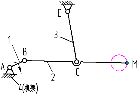 構(gòu)件1繞A點(diǎn)順時(shí)針?lè)较蜣D(zhuǎn)動(dòng)時(shí),構(gòu)件2上M點(diǎn)以逆時(shí)針?lè)较蜣D(zhuǎn)動(dòng),其軌跡為近似圓形。