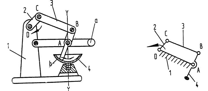 圖1-2a所示為攪拌機(jī)Ⅱ的結(jié)構(gòu)示意圖,1-2b是攪拌機(jī)構(gòu)的運(yùn)動(dòng)簡(jiǎn)圖。鉸鏈四桿機(jī)構(gòu)DCBA的搖桿4繞軸線A轉(zhuǎn)動(dòng),搖桿4既為漿葉。軸線A實(shí)際上是搖桿4與機(jī)架1形成的轉(zhuǎn)動(dòng)副。重物a用以漿液壓向碗底。在曲柄2轉(zhuǎn)動(dòng)時(shí),漿液4沿碗底b滑動(dòng);碗底做成中心在A點(diǎn)的球形表面。碗繞鉛垂軸線Y-Y轉(zhuǎn)動(dòng),其傳動(dòng)裝置在圖中未畫(huà)出。