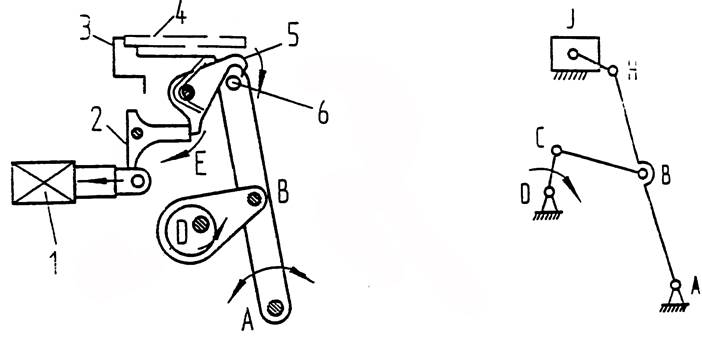 機(jī)構(gòu)說(shuō)明:圖1-1所示為卡片穿孔機(jī)的送卡片機(jī)構(gòu),圖1-2是其送卡片時(shí)的機(jī)構(gòu)運(yùn)動(dòng)簡(jiǎn)圖。根據(jù)螺線管1的輸入信號(hào),向左拉動(dòng)棘爪2時(shí),E部松開(kāi),棘爪5落下卡住軸6組成轉(zhuǎn)動(dòng)副。于是,偏心軸的運(yùn)動(dòng)得以傳遞給滑座3,將卡片4送出。偏心軸一直不動(dòng),只有當(dāng)軸6被棘爪鉤住時(shí),才能移送卡片。