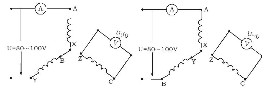 先用萬(wàn)用表測(cè)出各相繞組的兩個(gè)線端,將其中的任意兩相繞組串聯(lián),如圖3-2所示。將控制屏左側(cè)調(diào)壓器旋鈕調(diào)至零位,按下“啟動(dòng)”按鈕,接通交流電源。調(diào)節(jié)調(diào)壓旋鈕,并在繞組端施以單相低電壓U=80~100V,注意電流不應(yīng)超過(guò)額定值,測(cè)出第三相繞組的電壓, 如測(cè)得的電壓值有一定讀數(shù),表示另兩相繞組是末端與首端相聯(lián),如圖3-2(a)所示。反之,如測(cè)得電壓近似為零,則另兩相繞組是末端與末端(或首端與首端)相聯(lián),如圖3-2(b)所示。用同樣方法測(cè)出第三相繞組的首末端。
