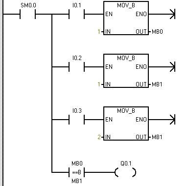 實驗步驟,將上圖所示程序下載至PLC中,分別接通I0.1,I0.2,I0.3觀察輸出Q0.1變化