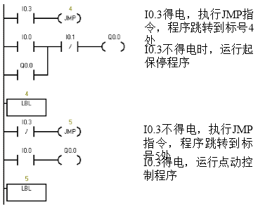 設(shè)I0.3為點動/連動控制選擇開關(guān),當(dāng)I0.3得電時,選擇點動控制;當(dāng)I0.3不得電時,選擇連續(xù)運行控制。采用跳轉(zhuǎn)指令控制的點動/連動控制程序如下圖所示