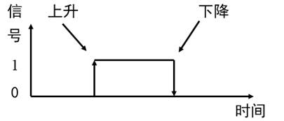 當(dāng)信號從0變1時,將產(chǎn)生一個上升沿(或正跳沿),而從1變0時,則產(chǎn)生一個下降沿(或負(fù)跳沿),如下圖所示。