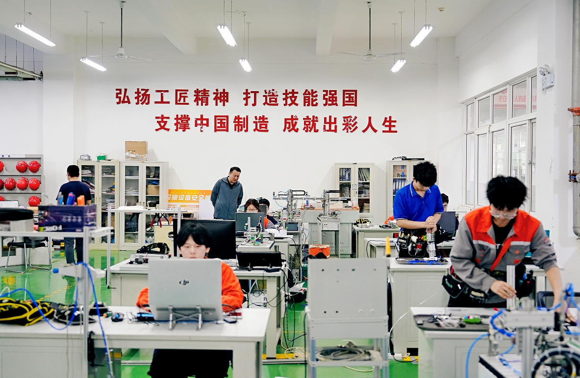 在工業(yè)機(jī)器人虛擬仿真實(shí)訓(xùn)基地內(nèi),學(xué)生可在1:1復(fù)現(xiàn)的企業(yè)生產(chǎn)線環(huán)境中實(shí)訓(xùn)。該校黨委書記張林介紹,學(xué)校先后與500余家龍頭企業(yè)開展校企合作產(chǎn)教融合,現(xiàn)有現(xiàn)代學(xué)徒制、現(xiàn)場工程師、訂單式培養(yǎng)(冠名班)260余個(gè),教師企業(yè)實(shí)踐流動(dòng)站21個(gè),校外實(shí)訓(xùn)基地360余個(gè)。