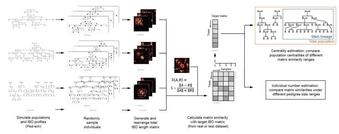 由于M13墓中的個(gè)體是二次埋葬,可能存在采樣不全和隨機(jī)性等問題,而且人骨保存情況普遍較差只能獲取到墓中部分個(gè)體的全基因組數(shù)據(jù),很難通過傳統(tǒng)的親緣關(guān)系推斷方式構(gòu)建完整家系結(jié)構(gòu)。本研究建立了一種基于IBD共享模式和家系模擬的模糊推斷方式用于從稀疏采樣的M13樣本集中提取有關(guān)親緣結(jié)構(gòu)的信息,并估計(jì)其所屬社群的總?cè)藬?shù)范圍等。統(tǒng)計(jì)模擬結(jié)果推斷M13墓中的個(gè)體來自于男性血緣鏈接主導(dǎo)的單一家系(高于75%的后驗(yàn)概率下),其總?cè)丝谝?guī)?赡艹^200人(高于85%的后驗(yàn)概率下)?脊艑W(xué)的一種代表性觀點(diǎn)認(rèn)為仰韶文化晚期這種大型二次合葬墓盛行的原因可能是為了逝去的家族成員團(tuán)聚而重新埋葬,以強(qiáng)化本家族以血緣為紐帶的凝聚力,增強(qiáng)后代對(duì)家族的認(rèn)同等。本研究首次利用分子人類學(xué)與遺傳學(xué)實(shí)證支持了這一猜測(cè),實(shí)現(xiàn)了有關(guān)人類早期社會(huì)組織探究的新突破。