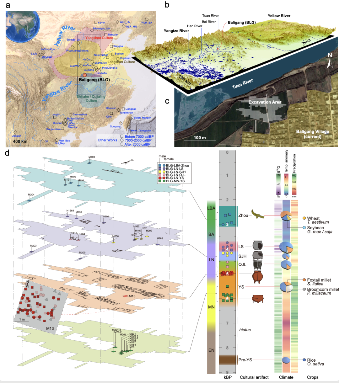 八里崗遺址位于河南省鄧州市,遺址面積2萬平方米,地處南陽盆地正中部、長(zhǎng)江支流-湍河南岸,屬于長(zhǎng)江中游北緣區(qū)域,是連接?xùn)|亞地區(qū)南北方文明的關(guān)鍵過渡地帶。遺址年代跨度長(zhǎng)(距今約8500年前的新石器時(shí)代早期—2000年前的漢代),考古文化堆積豐富,發(fā)現(xiàn)有賈湖一期文化、仰韶文化早中晚期、屈家?guī)X文化、石家河文化和龍山文化等多個(gè)史前文化時(shí)期,出土植物遺存分析表明稻粟黍各種作物的比例在不同時(shí)期存在一定的變化且這種變化與該遺址的考古學(xué)文化變遷相關(guān)聯(lián),并且該遺址從約6500年前開始有人骨遺骸的出現(xiàn)。這些證據(jù)使八里崗遺址成為研究史前長(zhǎng)江流域和黃河流域人群遷徙交流、文化互動(dòng)和農(nóng)業(yè)傳播的重要考古材料。除此之外,遺址發(fā)現(xiàn)了仰韶文化晚期(約5000年前)的多個(gè)大型二次合葬墓,其中最大的二次葬M13墓內(nèi)的個(gè)體超過90人,其背后復(fù)雜的社會(huì)組織和埋葬動(dòng)機(jī)長(zhǎng)久以來一直備受考古學(xué)和人類學(xué)領(lǐng)域的關(guān)注,是學(xué)術(shù)界的熱議問題之一。