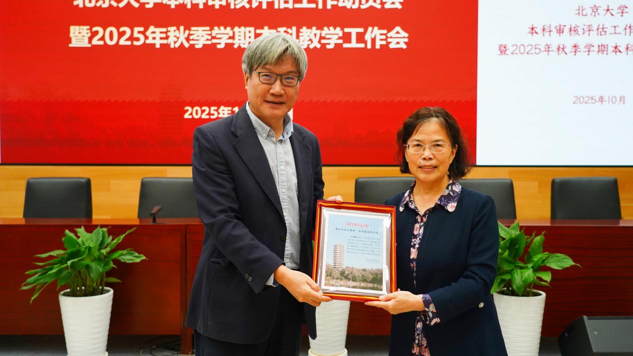 王博對本科審核評估工作進行了動員與部署。他強調(diào),要深刻認識審核評估的國家戰(zhàn)略意義,切實提高政治站位;要聚焦問題導向,推動北大教育教學改革再上新臺階;各單位要增強責任感和使命感,成立專項工作組,制訂詳細方案,確保評估任務高質(zhì)量完成;要堅持以評促建、以評促改、以評促強,把審核評估成果轉化為持續(xù)提升本科教育教學質(zhì)量的長效機制。王博為2025年離任的教學院長代表、化學與分子工程學院前教學院長王穎霞頒發(fā)感謝牌。